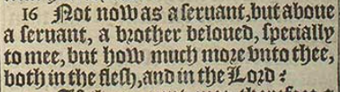 16 Not now as a seruant, but aboue a seruant, a brother beloued, specially to mee, but how much more vnto thee, both in the flesh, and in the Lord?