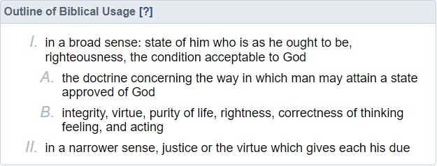 “δικαιοσύνη, -ης, ἡ, (δίκαιος); most frequently in the Sept. for צֶדֶק and צְדָקָה, rarely for חֶסֶד; the virtue or quality or state of one who is δίκαιος;