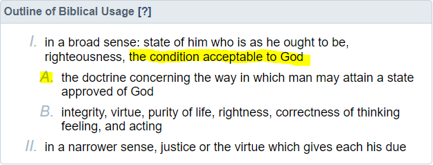 In Strong's wird “Rechtschaffenheit” als Zustand beschrieben, in dem jemand “für Gott akzeptabel” ist.