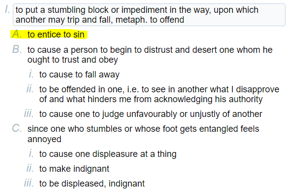 Im Griechischen ist das "skandalon " für "offence" und "skandalizō" für "offend".