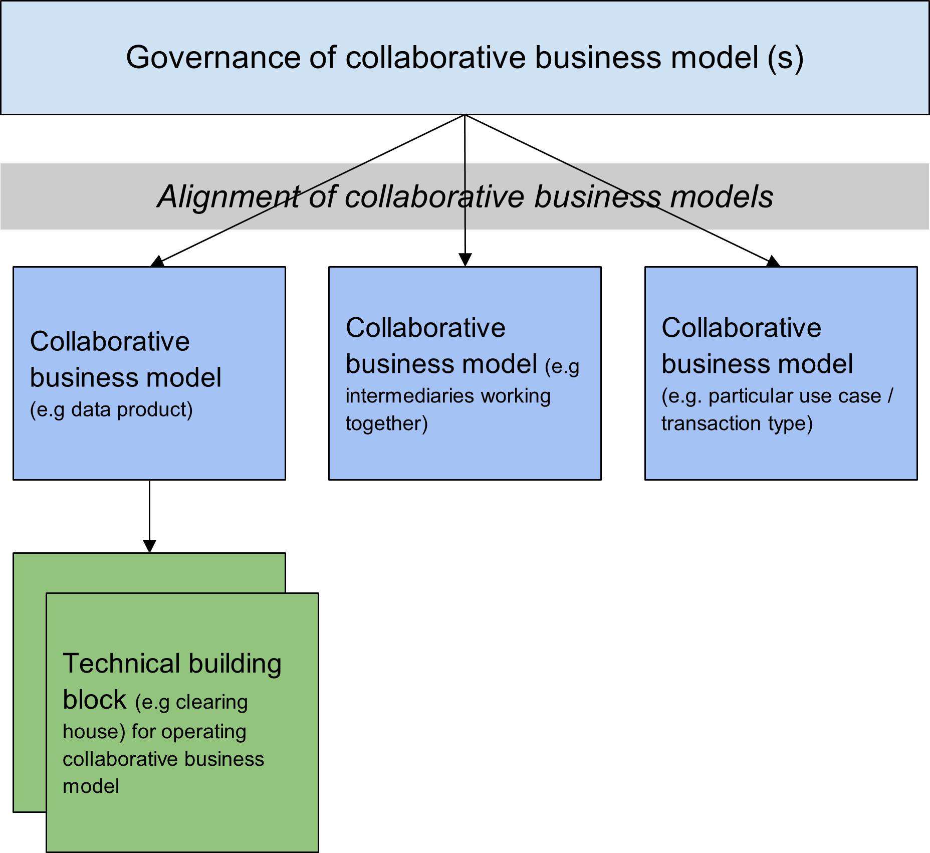 We distinguish between the individual collaborative business models of the data space (that are specific to a set of use cases, a set of data products, a set of stakeholder roles, or a set of intermediaries), their alignment, and their governance. The governance of the collaborative business model(s) refers to the development and enforcement of a set of rules concerning the business strategy of the data space. The governance of the collaborative business models is part of the governance framework of the data space. The coordination and alignment of the individual collaborative business models ensures that the design and implementation of individual collaborative business models comply with the rules set in the governance framework. The collaborative business models set some of the requirements for the technical building blocks, while the technical building blocks enable or facilitate the functions of the collaborative business models.