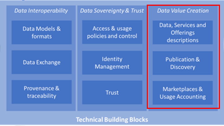The Data Value Creation category is one of the three DSSC categories of technical building blocks (in addition to Data Interoperability and Data Sovereignty & Trust). It addresses the above mentioned goals of data-driven business-ecosystems in three separate building blocks. These building blocks are described below.