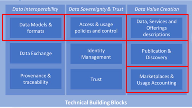 A Data Space contains building blocks for (i.) data interoperability, (ii.) building blocks for data sovereignty and trust, and (iii.) building blocks that enable data value creation. Together, these building blocks provide a framework for dynamic data transactions where data Providers and -Consumers are loosely coupled [1].