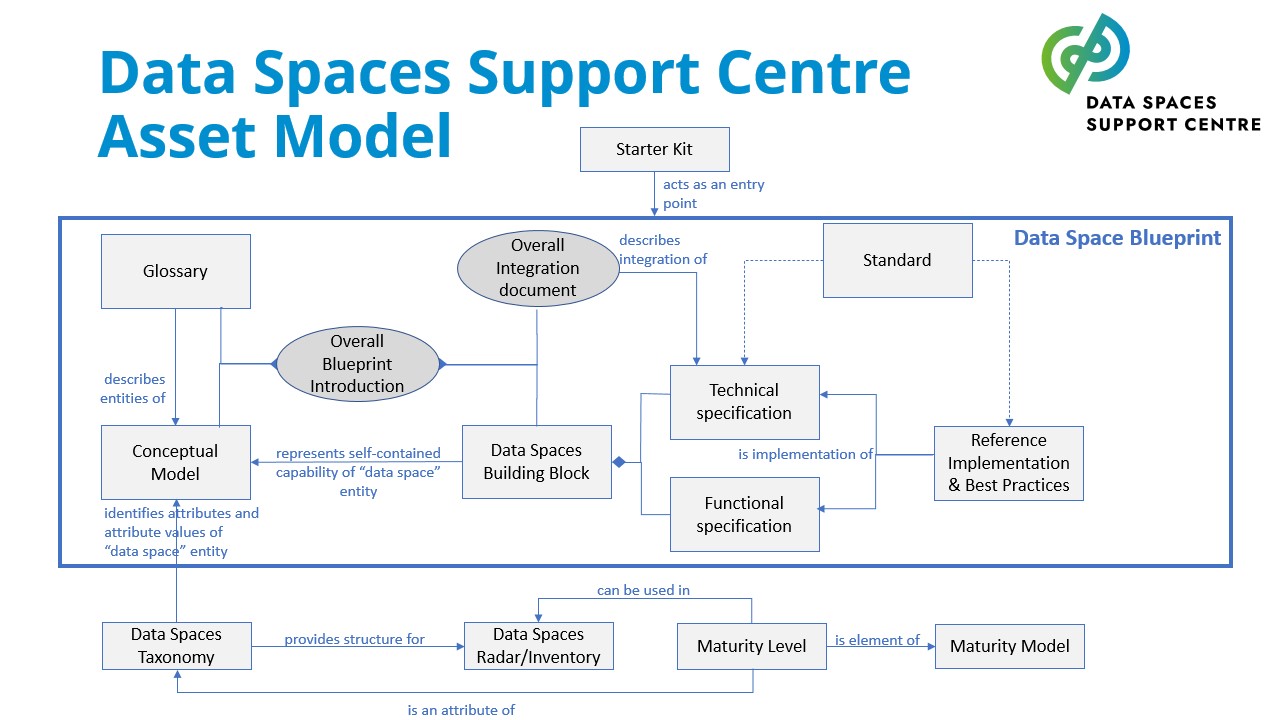 Beyond this, there will be other assets too. Some of them are mentioned in the picture. An example is the taxonomy of data spaces, which is used to create an inventory/radar of data space initiatives in Europe. Data Space Asset Model is more deeply presented and explained in another document to be published by the DSSC.