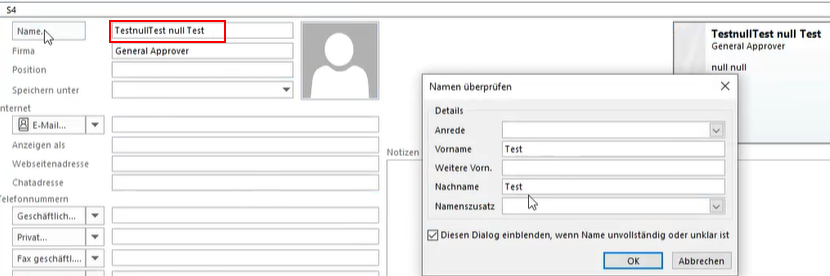 Bei der initialen Synchronisation von Kontakten aus dem S4 System in Richtung Outlook kam es in einigen Fällen zu einem Problem. Dabei wurde der Name des Kontakts an einigen Stellen ungeplant um den String “null” ergänzt. Diesen Fehler konnten wir beheben.