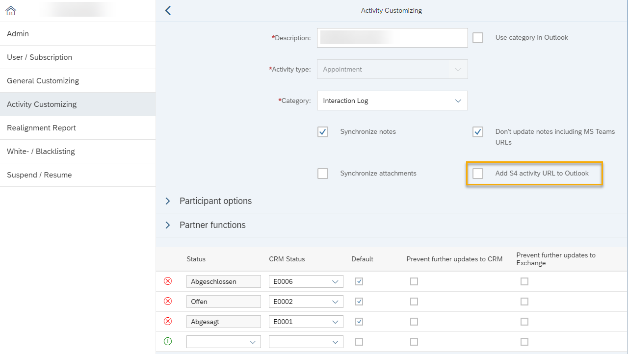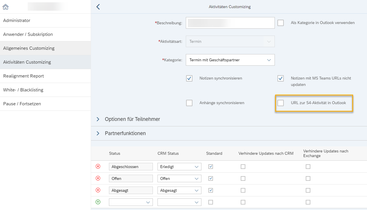 Mit diesem Release haben wir eine zusätzliche Funktion implementiert. Ab sofort kann eingestellt werden, dass eine Aktivität in Outlook auch eine URL enthält, die direkt zu dieser Aktivität im S4 System führt. Die entsprechende Option findet sich im Aktivitäten Customizing des Admincockpits und sie kann für jeden einzelnen Aktivitätstypen aktiviert werden: