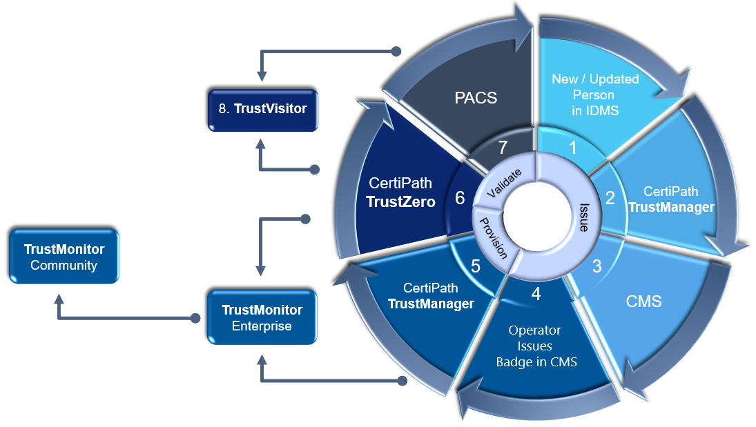 TrustManager is CertiPath’s integration solution for provisioning and lifecycle management of identity records and credentials across PACS. Traditionally, this capability has been possible within a single organization. However, TrustManager, when paired with CertiPath’s TrustMonitor, supports intercommunity federated provisioning as well.