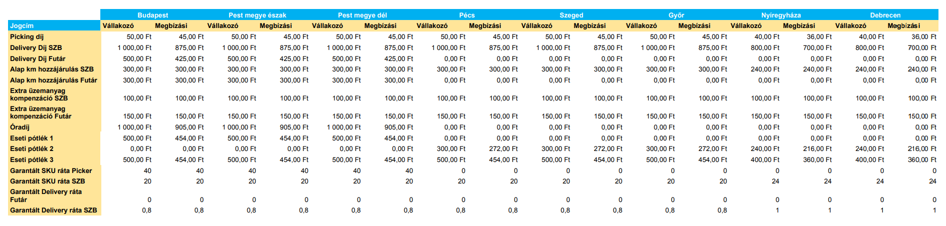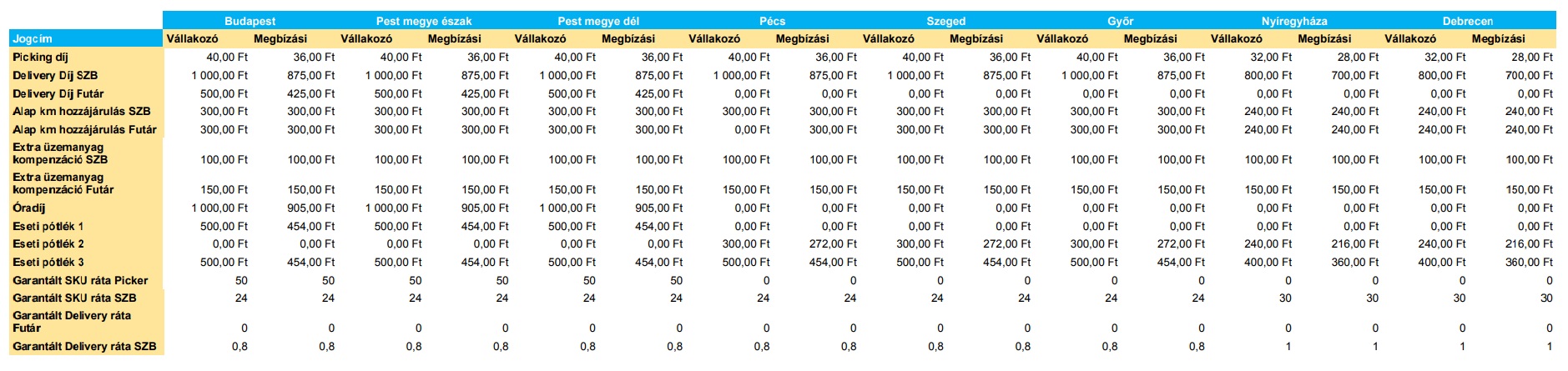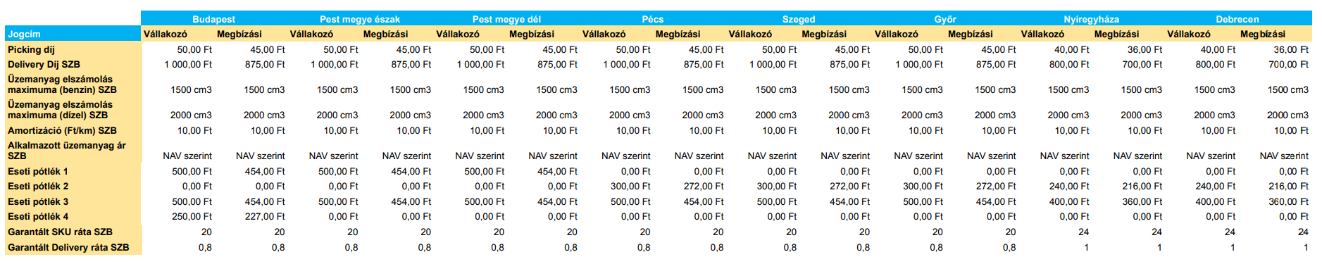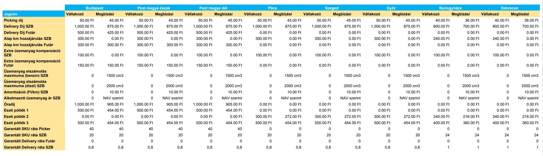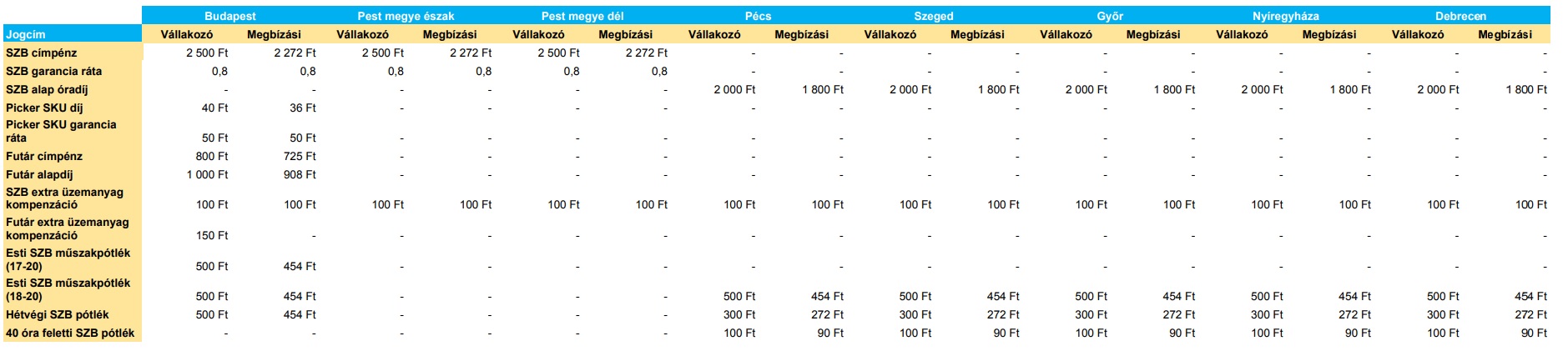 A táblázatokban feltüntetett összegek bruttó összegek és forintban értendőek, alanyi adómentes egyéni vállalkozók esetében nettó összegként értelmezendők.
