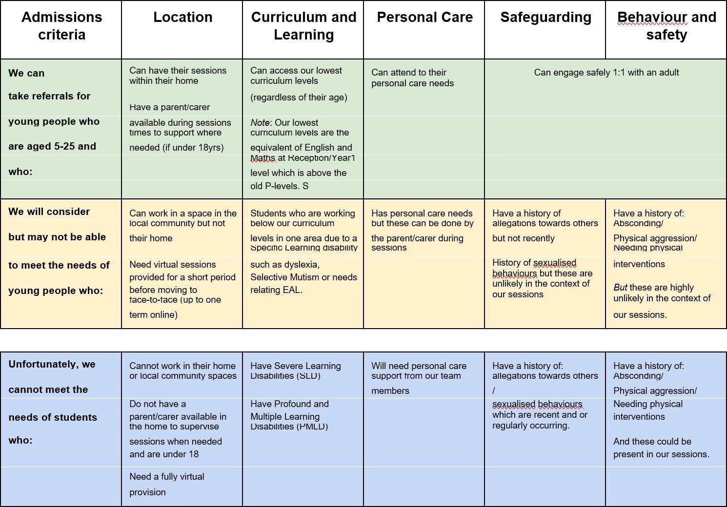 The Organisation may refuse an offer of provision if we feel we cannot meet a child or young person’s needs safely within the provision.